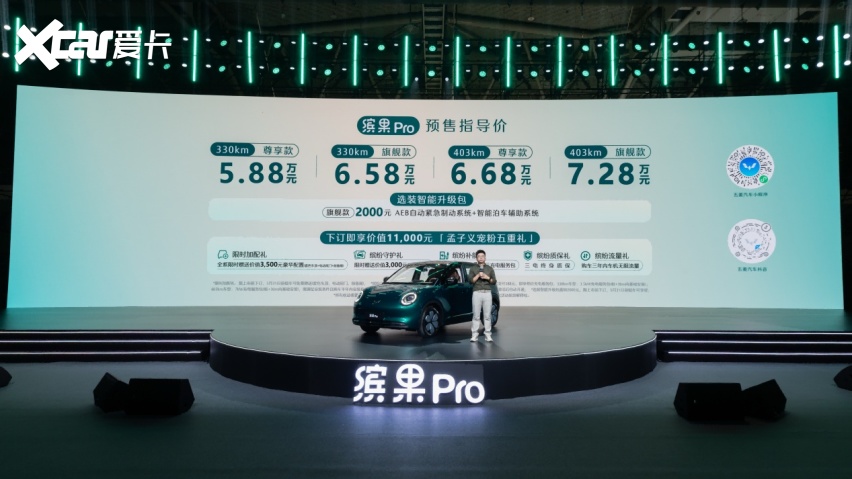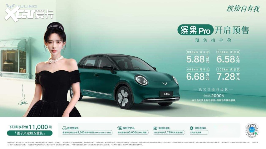 缤果Pro共推出330km尊享款、330km旗舰款、403km尊享款、403km旗舰款四款配置,预售指导价为5.88万-7.28万元,并推出至高价值11,000元的“孟子义宠粉五重礼”: