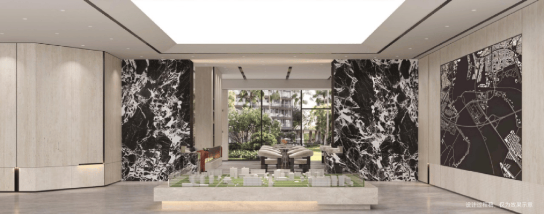 售楼处设计源自伦敦与上海半岛酒店的优雅复古,将现代极简主义美学运用到极致。沙盘区景墙将取材Celine御用石材宝格丽黑大理石,以永不过时的摩登气息,点睛空间的奢华精致。