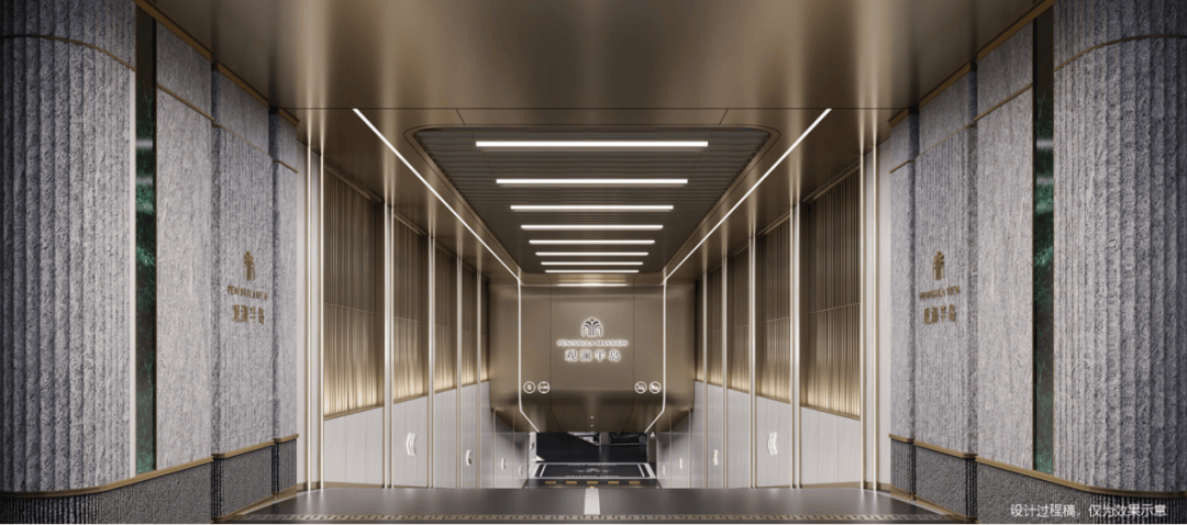 大堂入口取意于上海半岛酒店抬首即见的星河璀璨,灵动光影点缀归家的路。地库入口的一抹“普拉达绿”和顶部透光仿云石顶设计,如同时光的礼赞,迎接每一位业主的归来。