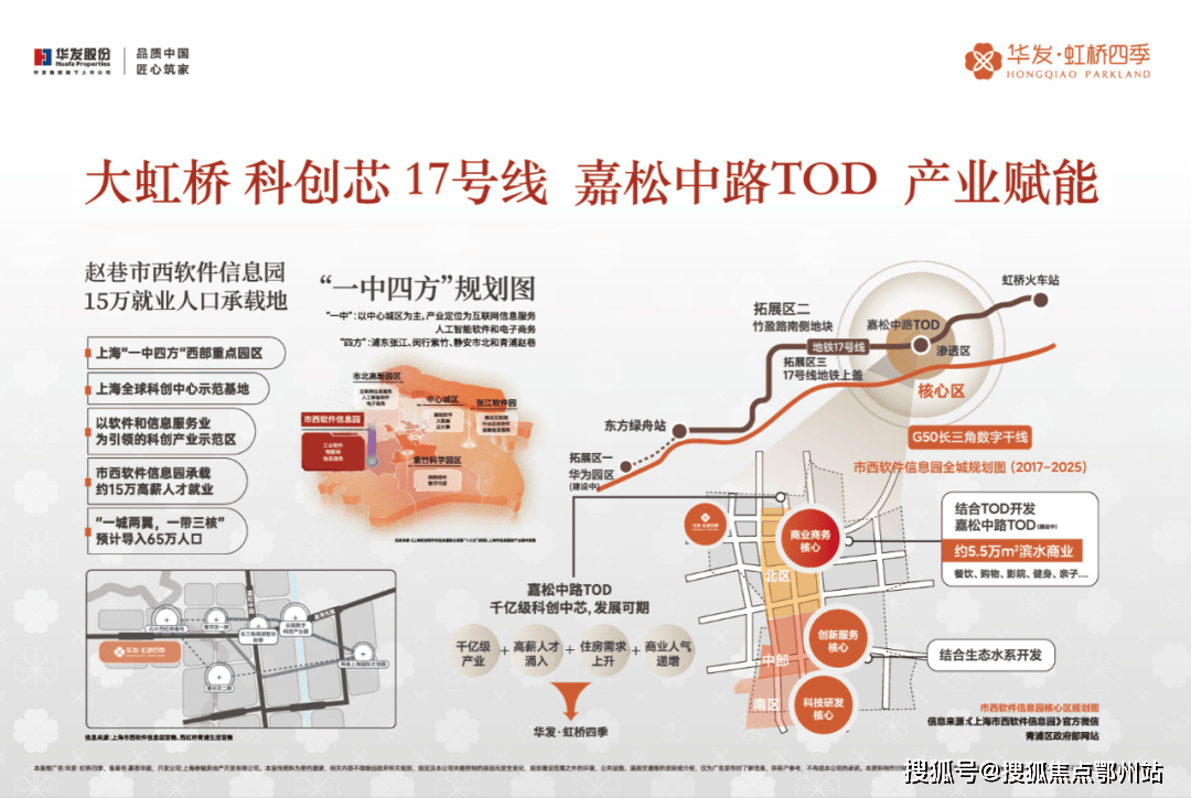 当前的青浦以“一城两翼,一带三核” 为发展战略目标。以17号线为轴线串联起三大核心节点,东起徐泾北斗产业基地,西到金泽华为研发基地,中部核心正是华发虹桥四季所在的赵巷市西信息软件园。